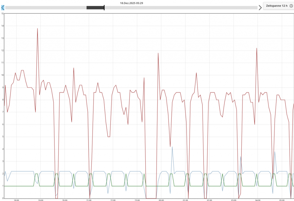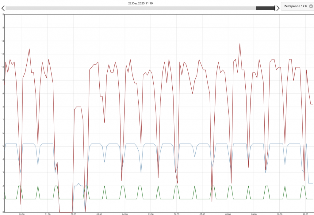 Der heiße Tipp für solche Fälle: Heizstab aktivieren und sich der warmen Hütte erfreuen. Langfristig muss man sich überlegen, ob die Wärmepumpe etwas zu klein dimensioniert ist. Das folgende Bild zeigt die Leistungsverläufe mit aktiviertem Heizstab.