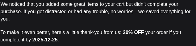 Heute am 24.12.2025 habe ich ein eMail von einem der Shopbetreiber bekommen. Man bietet mir einen Rabatt an: